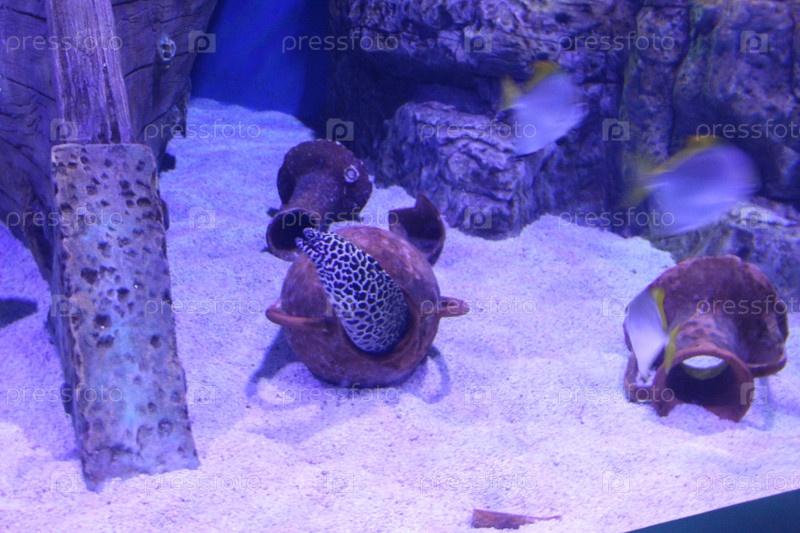 Муреновые прячутся в кувшине на дне аквариумного моря. Установка аквариума