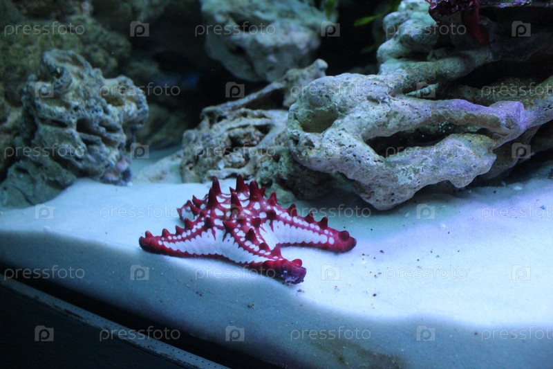 Красно-белая морская звезда лежит на стенке аквариума
