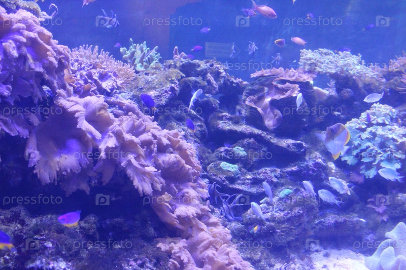 Кораллы и водоросли в воде на синем фоне