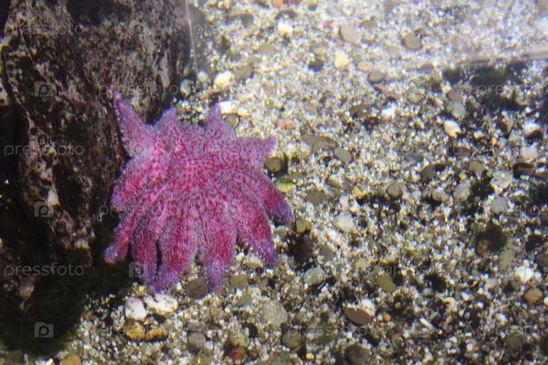 Розовая Pycnopodia helianthoides на сером каменистом фоне в прозрачной морской воде