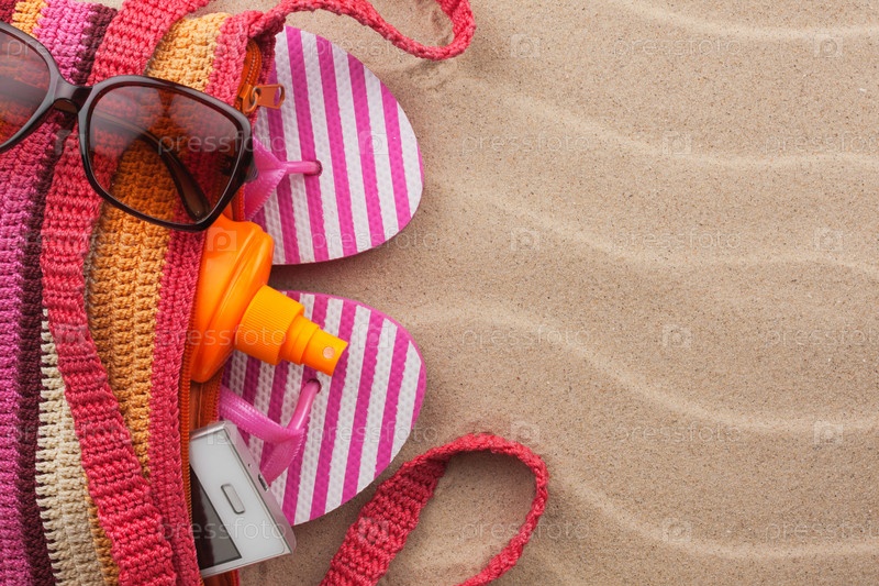 Пляжная сумка с солнцезащитным кремом, шлепанцами, мобильным телефоном, солнцезащитными очками