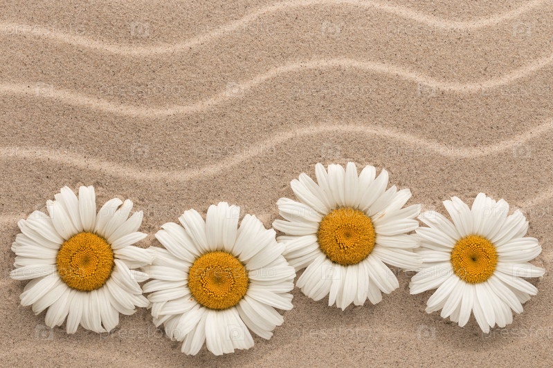 Белоснежные ромашки лежат на песчаных дюнах. Копировать пространство