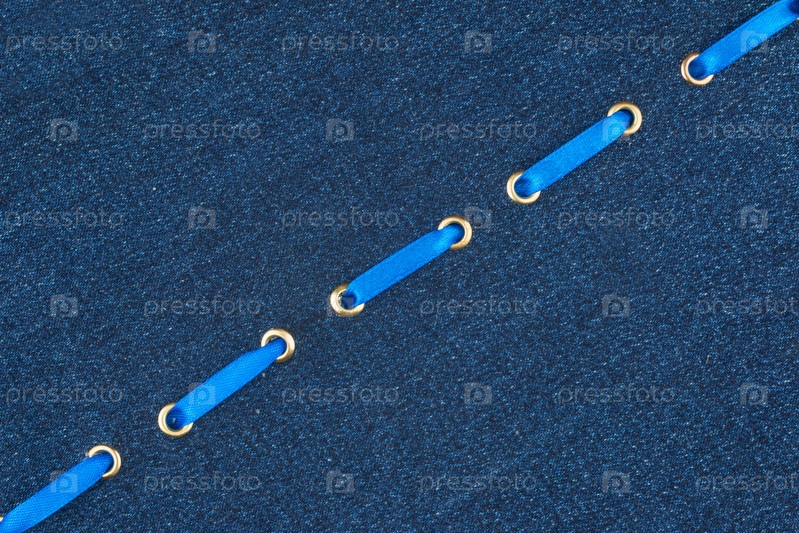 Модный фон, синяя атласная лента вставлена в джинсовую ткань