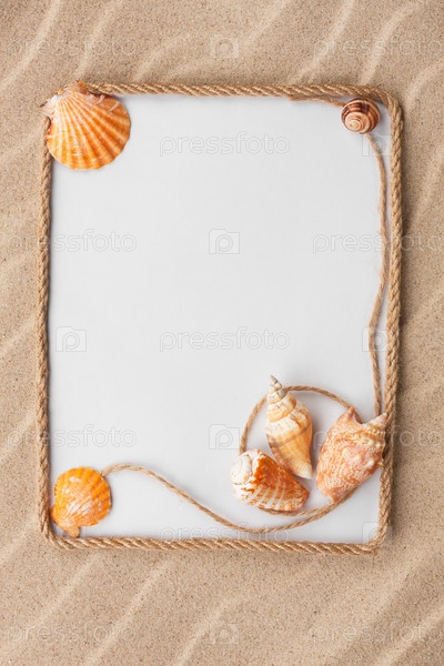 Красивая рамка из веревки и ракушек на белом фоне на песке