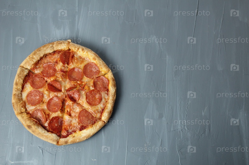 Круглая пепперони на пицце на сером фоне, верхний угол. День пиццы пепперони