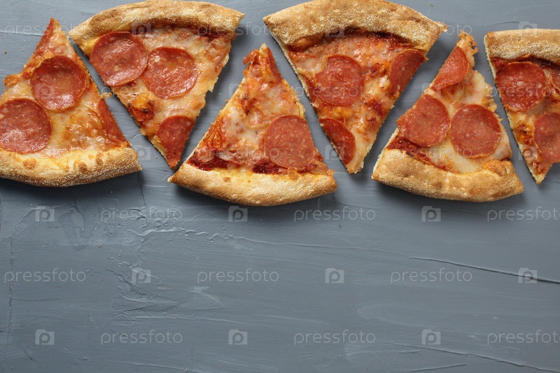 Огранка кусочков пиццы на сером фоне с пространством для текста copyspace. Вид сверху. Фон пицца для кафе, пиццерии