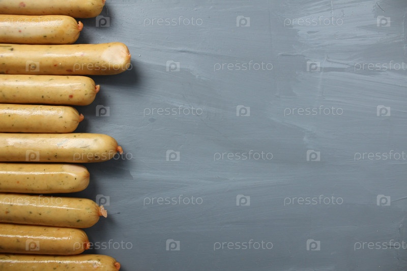 Колбаски из альтернативного мяса. Мясные продукты на сером фоне. Мясные или соевые колбаски