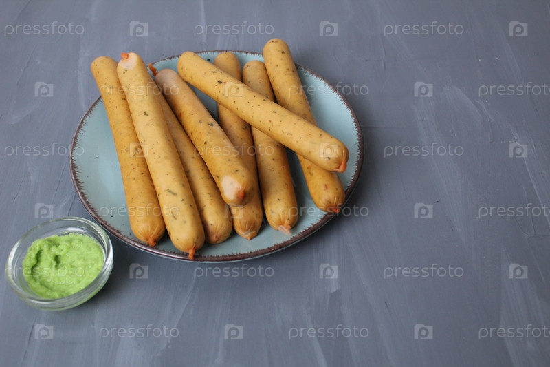 Сосиски мясные продукты на тарелке на сером фоне с местом для текста Copyspace вид со стороны Концепция домашних колбас