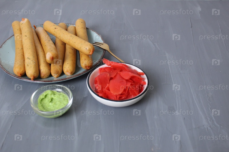 Колбасы с красным и зеленым соусом на сером фоне с пространством для текста copyspace. Боковый угол. Концепция домашних мясопродуктов