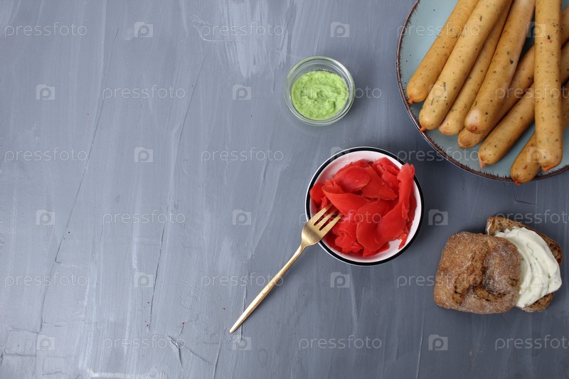 Соус васаби на сером фоне. Подается закуска, хлеб, сыр, сосиски, соусы на сером фоне, копирайтс, место для текста