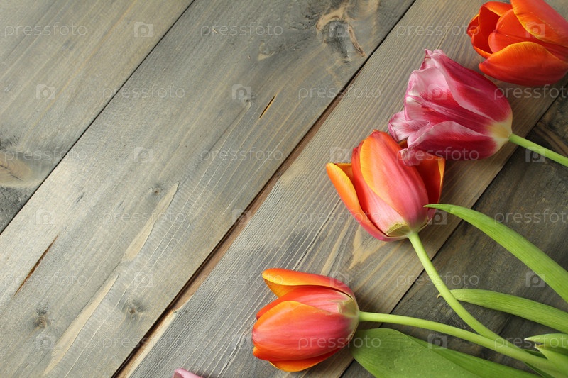 Тюльпаны на деревянном фоне с пространством для текста copyspace Верхний угол Концепция весеннего праздника Международного женского дня
