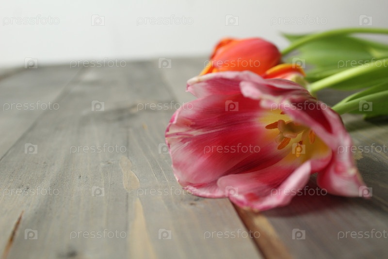 Розовый тюльпан на сером фоне с местом для текстового кописпейса