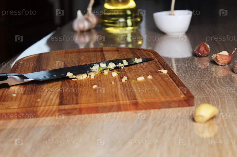Измельченный измельченный чеснок на разделочной доске рядом с ножом. Приготовление рецепта чесночного масла. Нарезка овощей