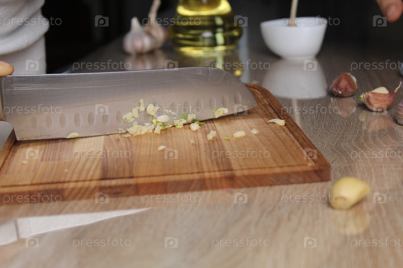 Нож и мелкий чеснок на разделочной доске, масло на заднем плане. Методы нарезки чеснока