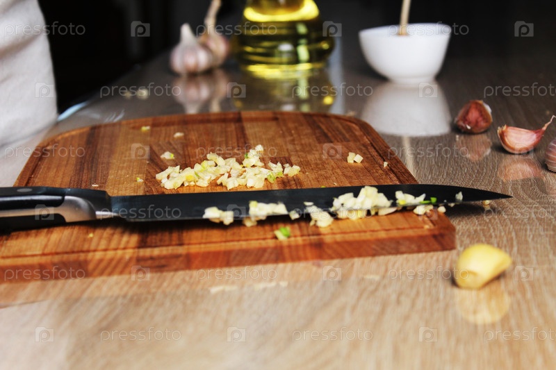 Измельченный чеснок на доске. Нож и чеснок на кухонной доске. Масло, чеснок, перец, резкие, сильные неприятные запахи на кухне
