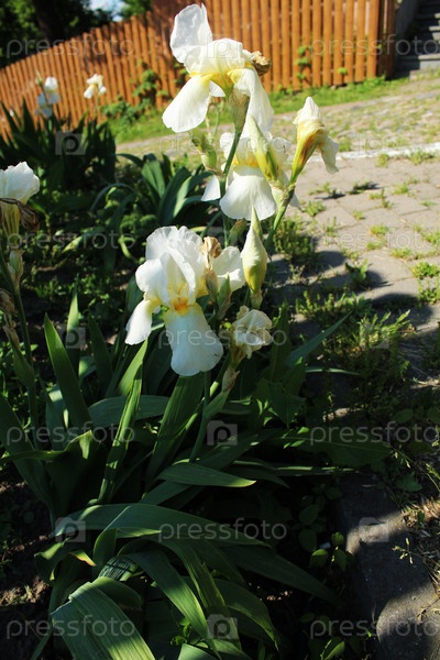 Iris germanica. белые ирисы растут рядом с пешеходной дорожкой. цветы на клумбе