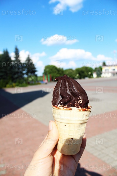 Мороженое в руке летом в парке. Шоколадное мороженое