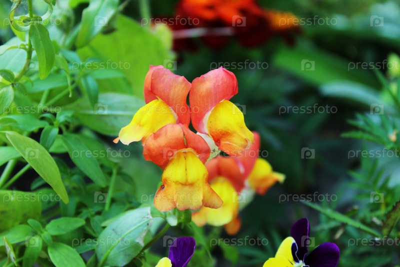 Цветки желтовато-красный львиный зев Antirrhinum majus.Цветы для летней клумбы