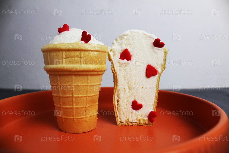 Сливочное мороженое в вафельном стаканчике, украшенное красными сердечками