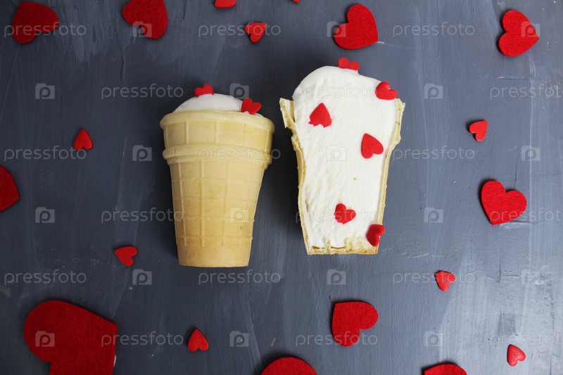 Мороженое и сердечки на сером фоне. Сладкое сливочное мороженое на сером фоне