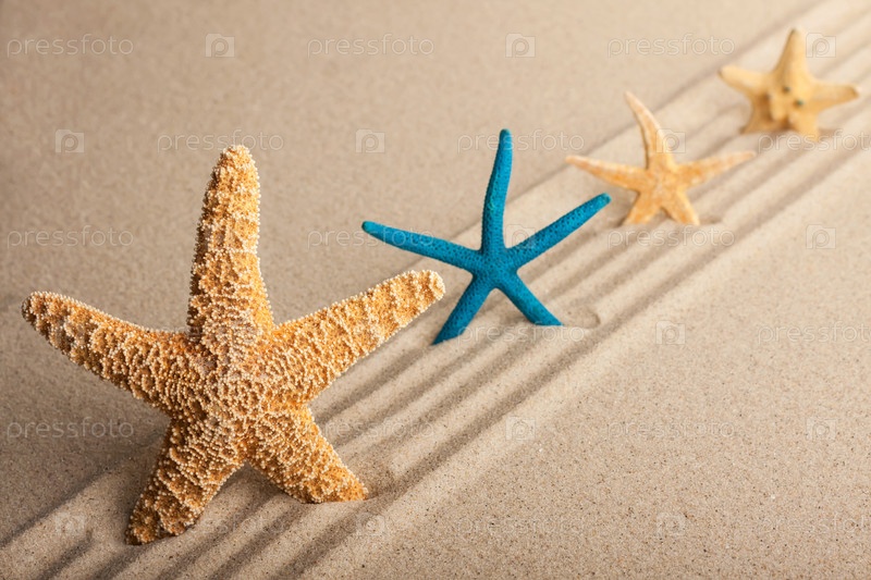 Четыре морские звезды на песке
