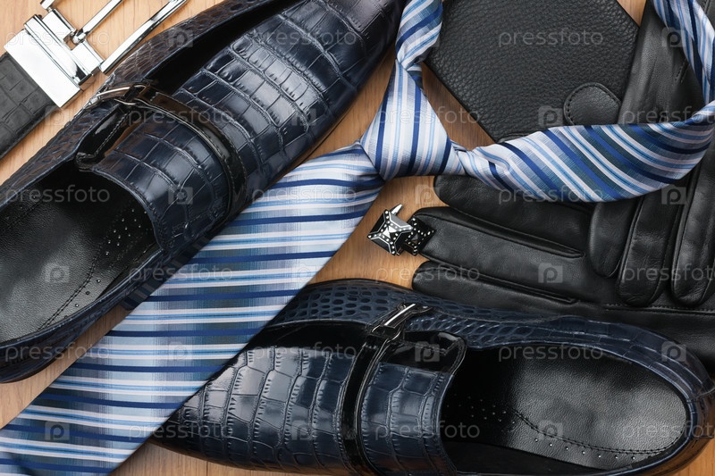 Классические мужские туфли, галстук, запонки, перчатки, ремень, кошелек на деревянном полу