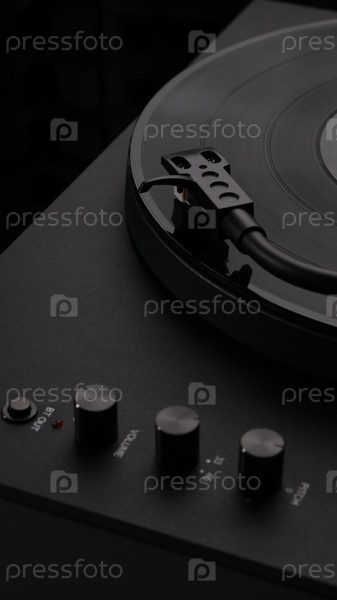 Виниловая пластинка, крутящаяся на проигрывателе, создает музыку для атмосферы.виниловый проигрыватель черный