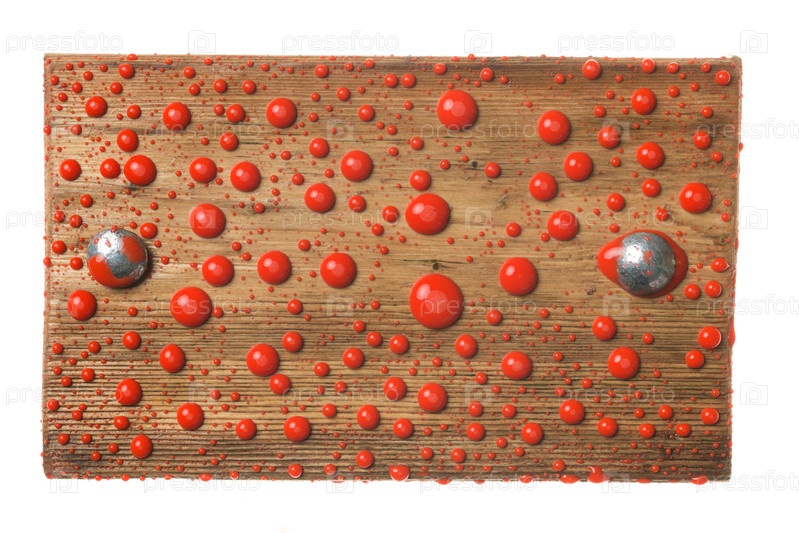 Деревянная доска с железными болтами в каплях красной краски. Изолированная