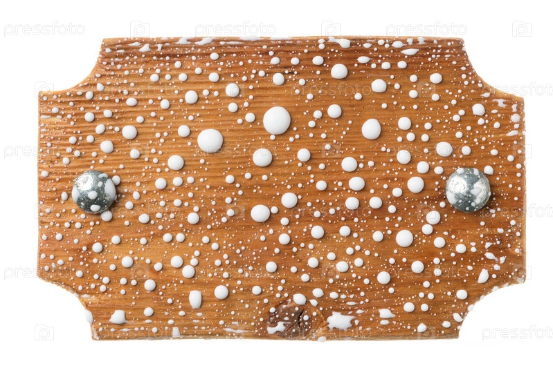 Деревянная доска с железными болтами в каплях белой краски. Изолированная