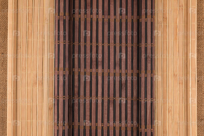 На мешковине лежат темный и светлый бамбуковый коврик в виде свитка