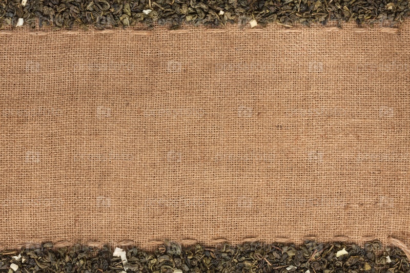 Зеленый чай, лежащий на мешковине