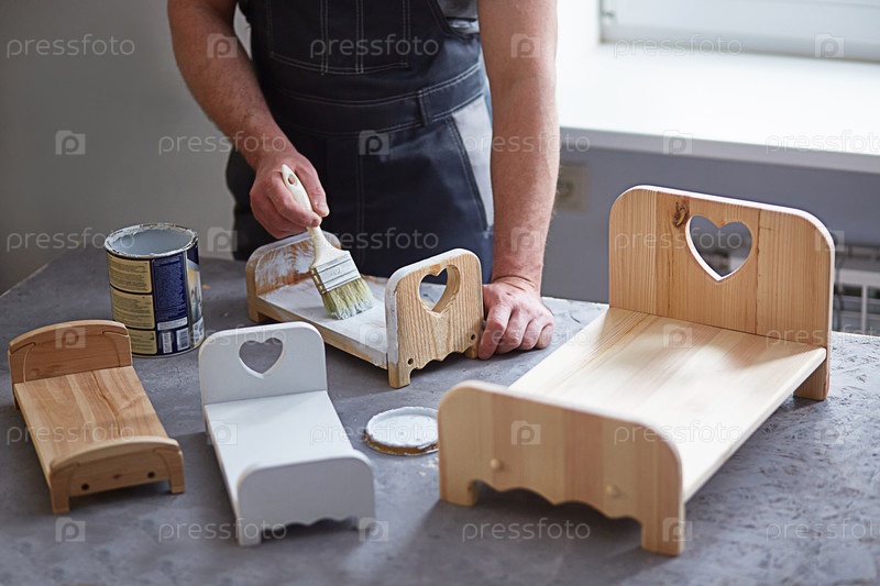 Безликий человек на работе, как ремесленник в мастерской, красит деревянные кукольные кровати. Рабочее пространство малого бизнеса или хобби