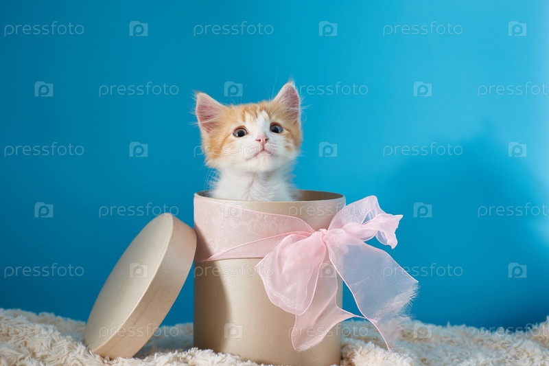 Рыжий котенок в цветочной коробке. Милый выглядывает из круглой бежевой коробки с бантом. Копировать пространство