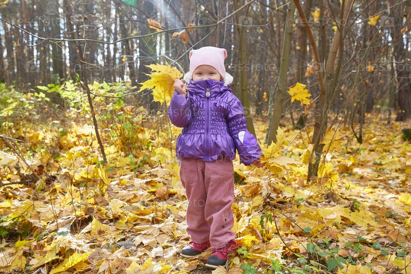 Ребенок в фиолетовой куртке идет по осеннему парку с желтыми кленовыми листьями