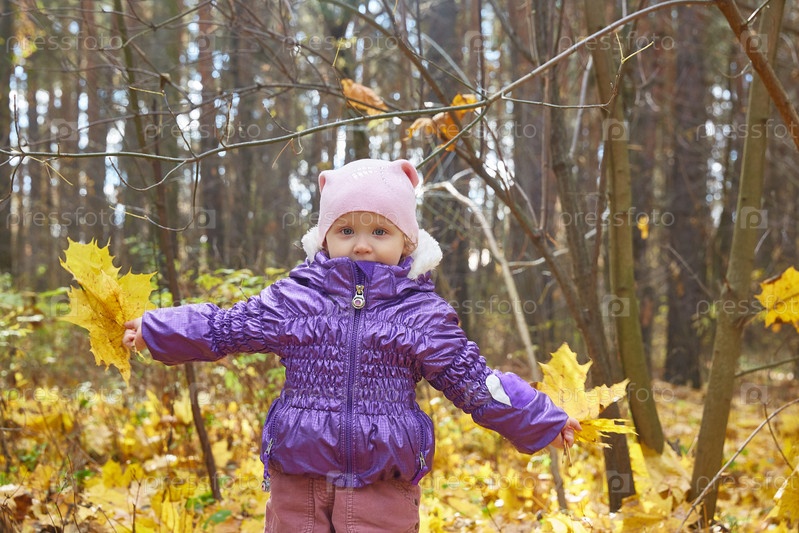 Ребенок в фиолетовой куртке идет по осеннему парку с желтыми кленовыми листьями
