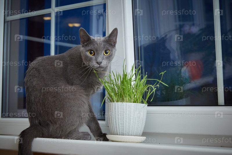 Кошка лижет траву для здоровья домашних животных на подоконнике. Концептуальное фото ухода за домашними животными и здорового питания для домашних кошек. Милый взрослый кот. Кошачий язык. Копировать пространство