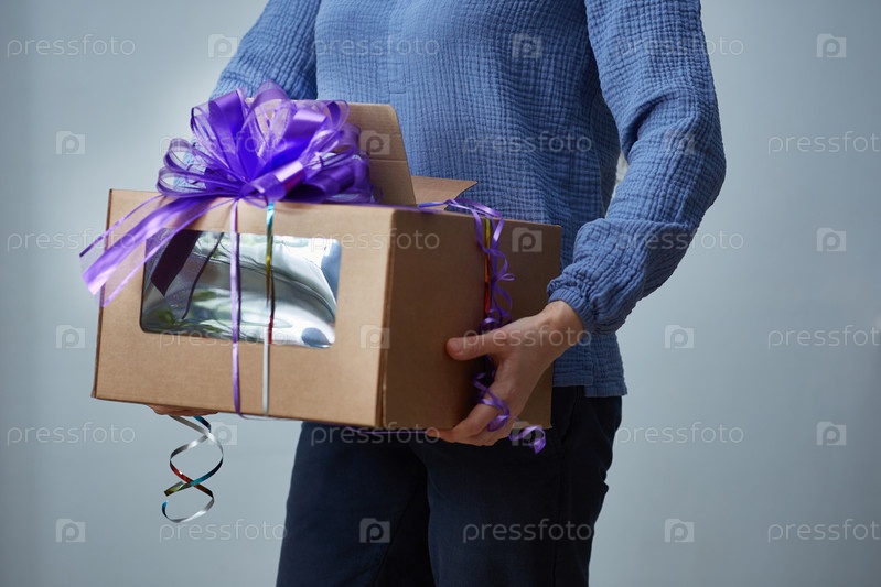 Коробка для торта в руках безликой женщины. Крафтовая упаковка. Концепция доставки