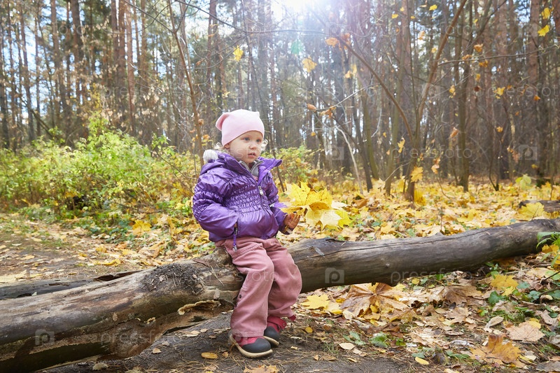 Девочка сидит на поваленном бревне в осеннем солнечном желтом лесу