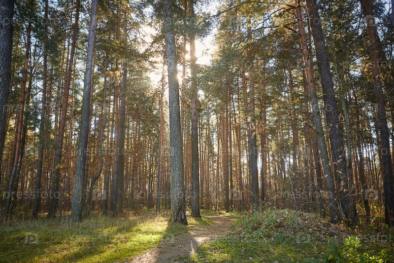 Осенний парк с соснами в солнечный день. Копировать пространство