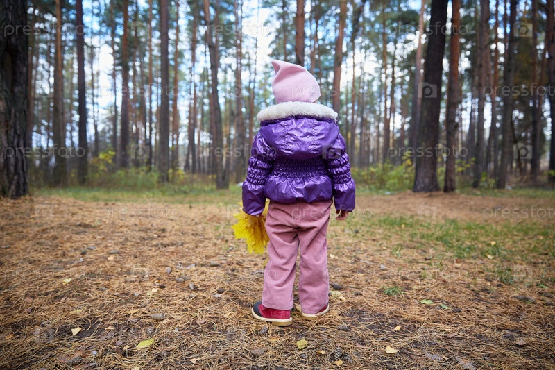 Маленький ребенок стоит спиной к камере в осеннем солнечном лесу. Люди на заднем плане