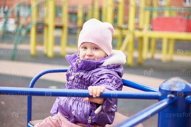 Крупный план девочки, сидящей на карусели на детской площадке