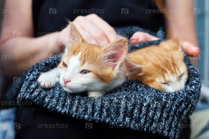 Руки молодой женщины гладят двух милых котят, лежащих у нее на коленях