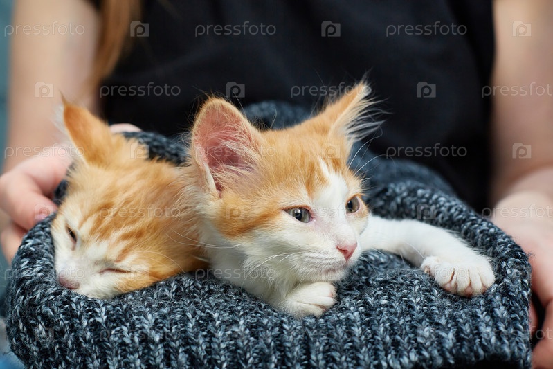 Два рыжих котенка лежат и дремлют на коленях у женщины, укрытые серым вязаным одеялом. Обезличенная женщина, женские руки на изображении