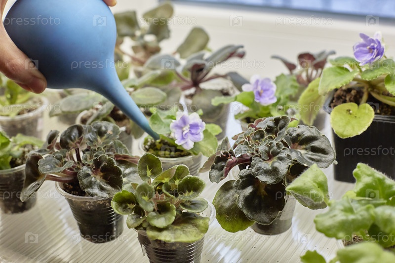 Сенполия, африканские фиалки, ростки фиалок узамбара. Фокус на фиалке. На заднем плане руки поливают зеленый росток. международное хобби и бизнес