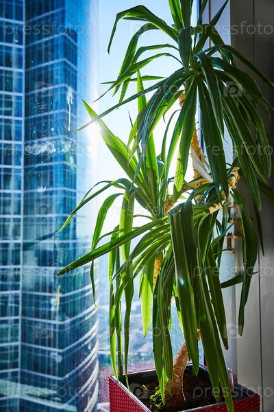 Подоконник с цветком и видом из окна небоскреба на Москву. вертикальная рама