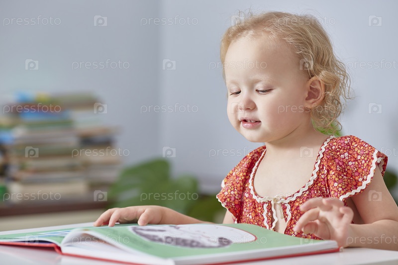 Кудрявая милая девочка-малыш читает книгу. Крупный план. Комната похожа на дом или библиотеку. Копировать пространство