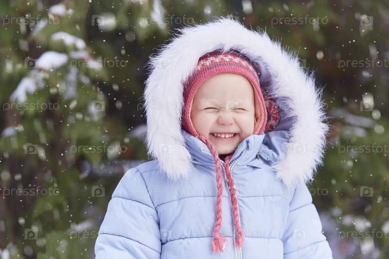 Счастливый малыш стоит под зимней заснеженной елью