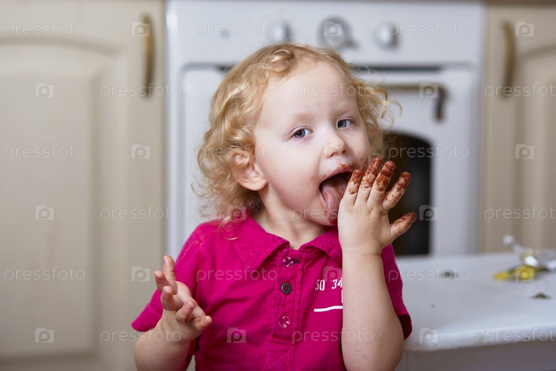 Кудрявая девушка облизывает пальцы, испачканные шоколадом