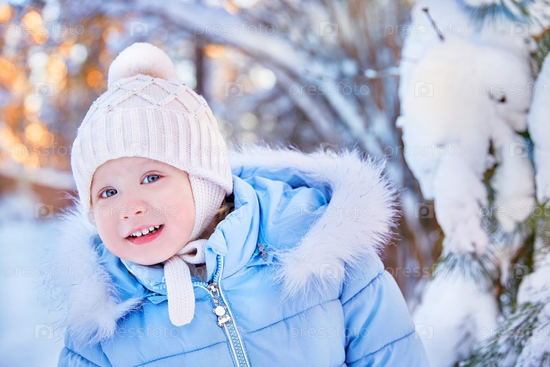 Портрет улыбающегося ребенка, смотрящего в кадр в камеру. Зимний пейзаж с сосной в снегу. Малыш одет в зимнюю куртку с мехом и теплую вязаную шапку