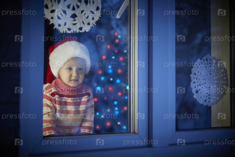 Ребенок смотрит в окно и ждет Санта-Клауса на Рождество или Новый год